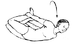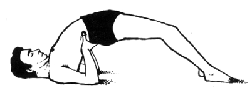 | POSTURES: 2. Ear Press: Roll all the way back on your shoulders and stay there. Let your knees cover your ears, touching the floor if possible. Give yourself a shoulder massage by swaying gently from side to side. |