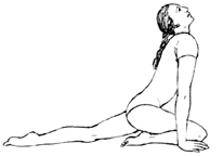 18. Single Leg Reverse. Stretch out the front of that same leg. Raise head high and emphasize the arch in the back. I usually support myself on my fists - not open palm on floor as shown. Put the foot of the bent leg more in front of you than shown - so the heel is under the thigh of the extended leg and you can collapse down on the bent leg, putting your forehead on the floor as the second part of the pose (not shown). Then, repeat 17 and 18 on the other side. |